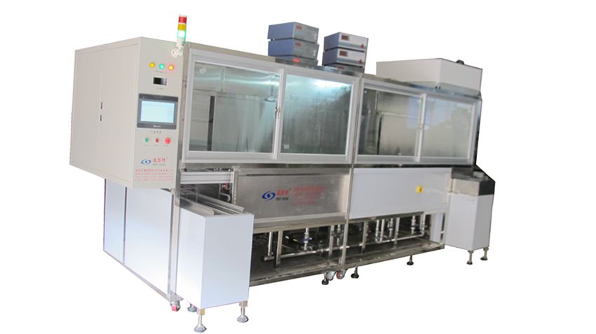 自動上料→1槽清洗劑超聲清洗28K→2槽清洗劑超聲清洗40K→3槽純水超聲漂洗28K→4槽純水超聲漂洗40K→5槽純水超聲漂洗40K→6槽熱風烘干→自動下料。